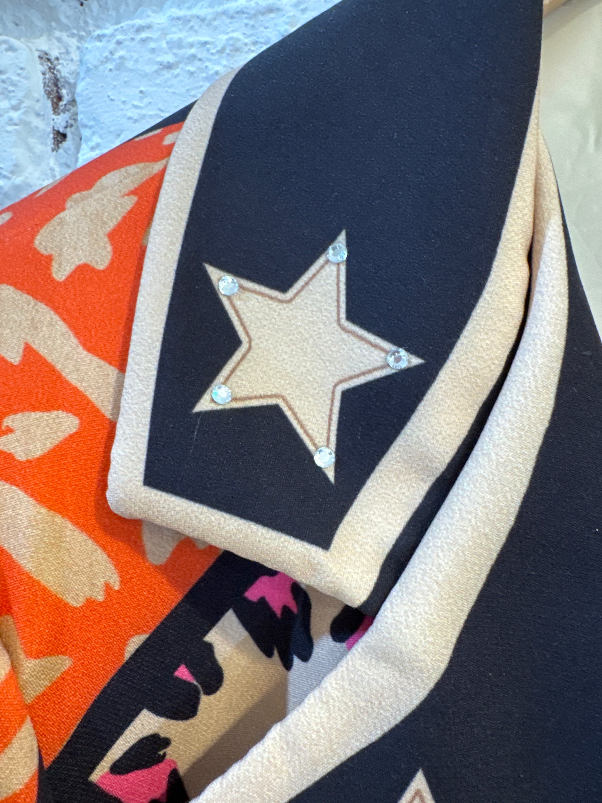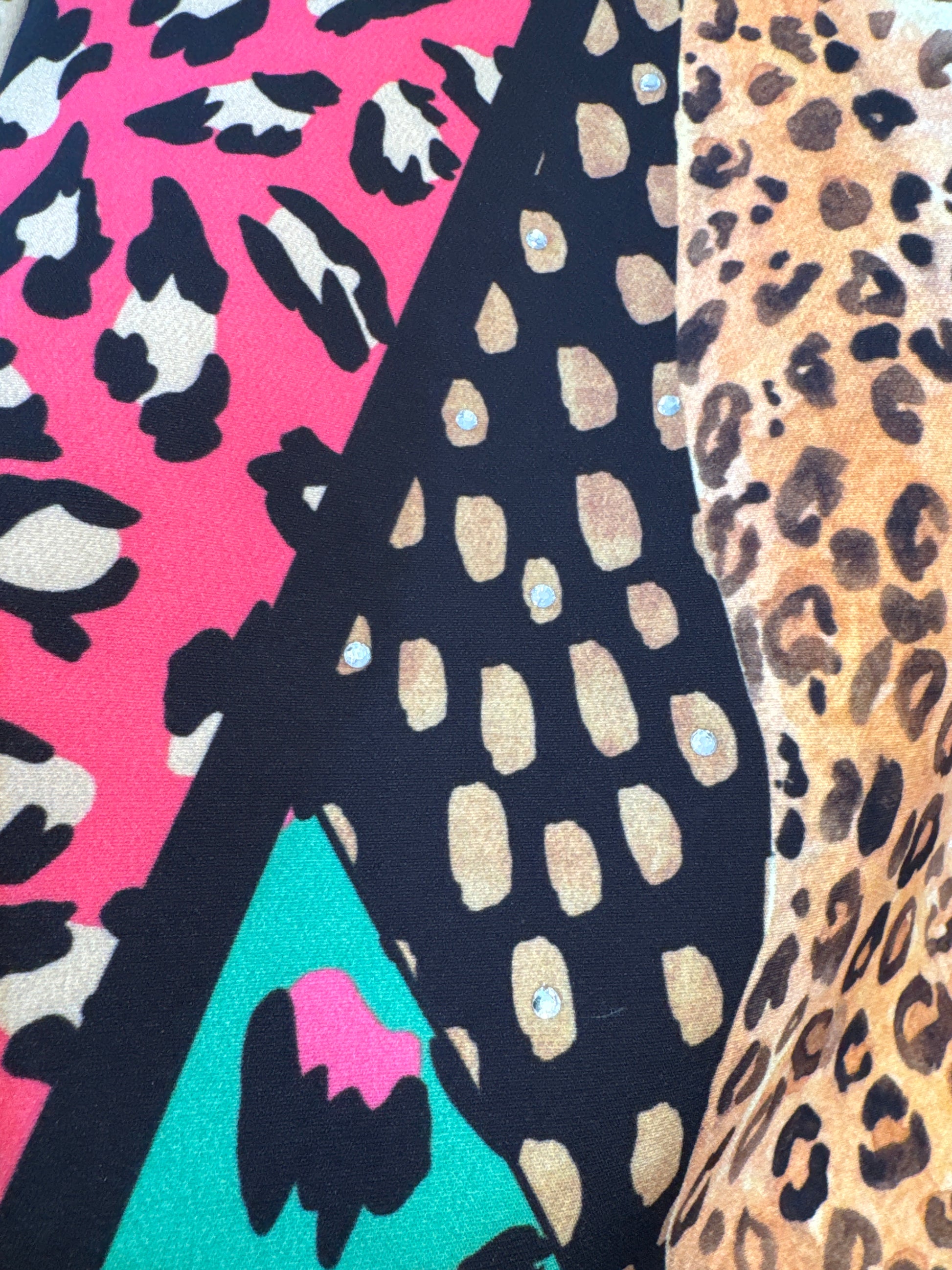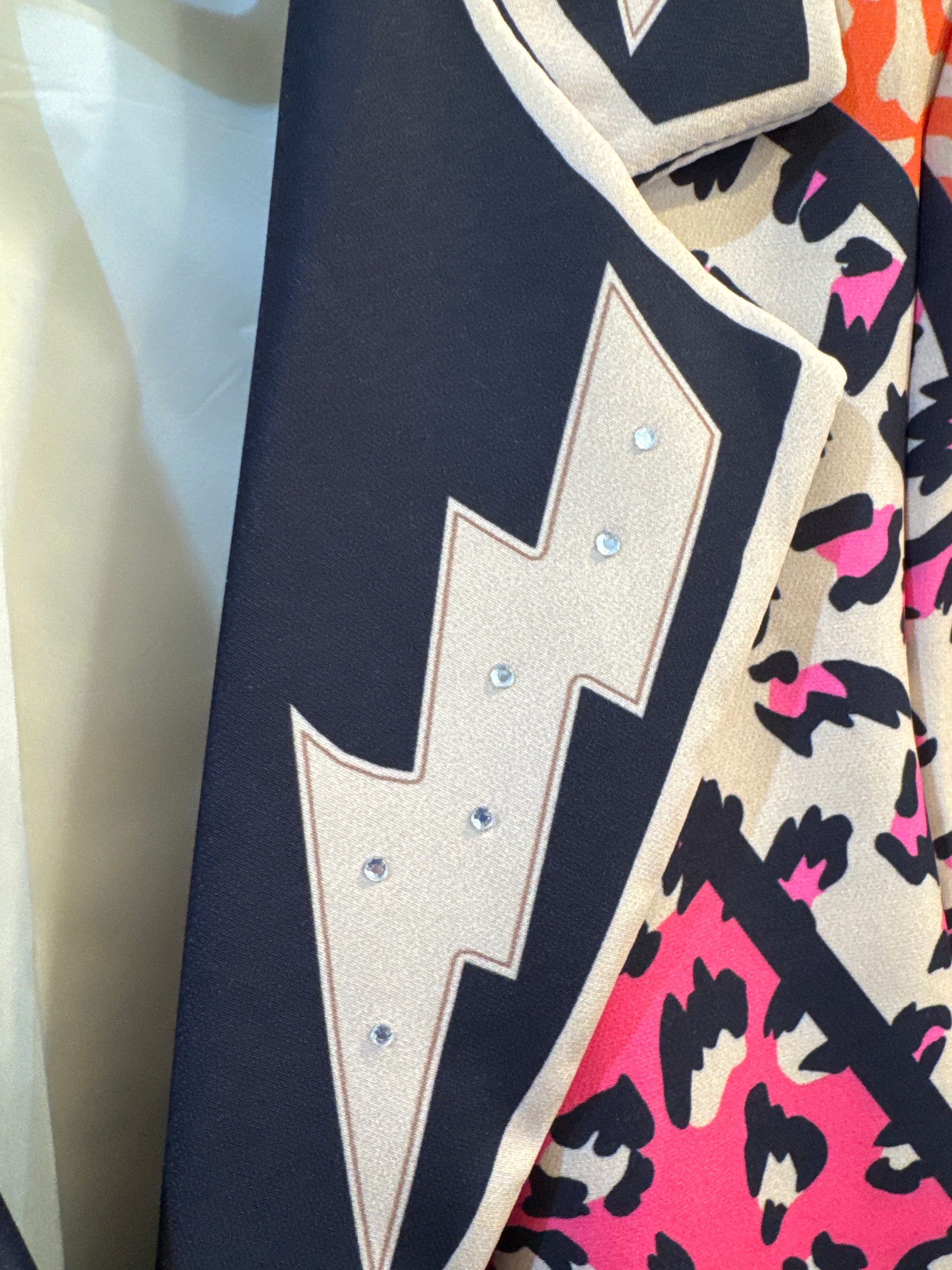 Chaqueta blazer multicolor en tonos flúor, con un leopardo audaz y detalles rockeros. Adornada con brillantes para un look que ilumina tu estilo con actitud y energía.