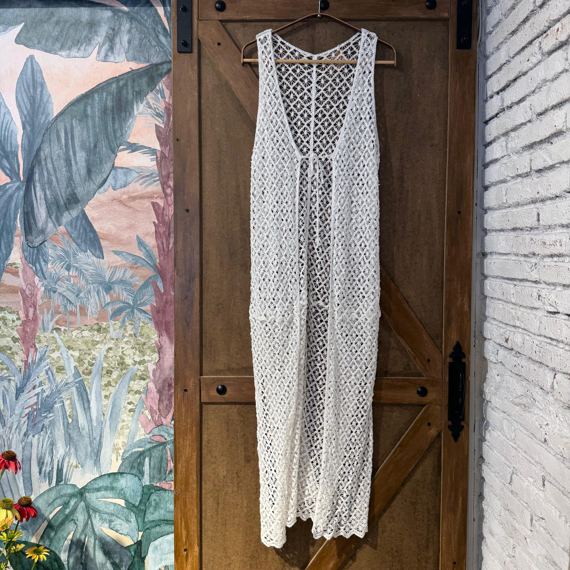 Chaleco calado de punto blanco largo con aperturas laterales y lazo para anudar en el pecho